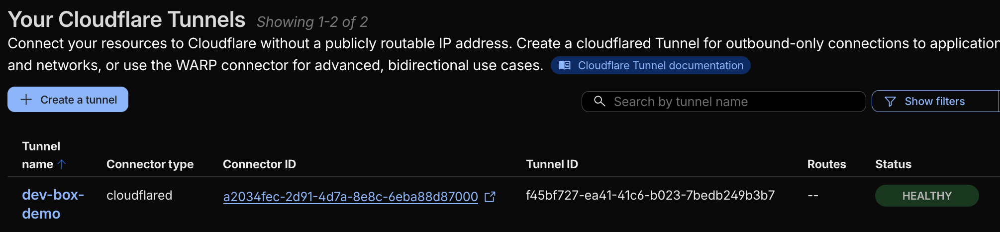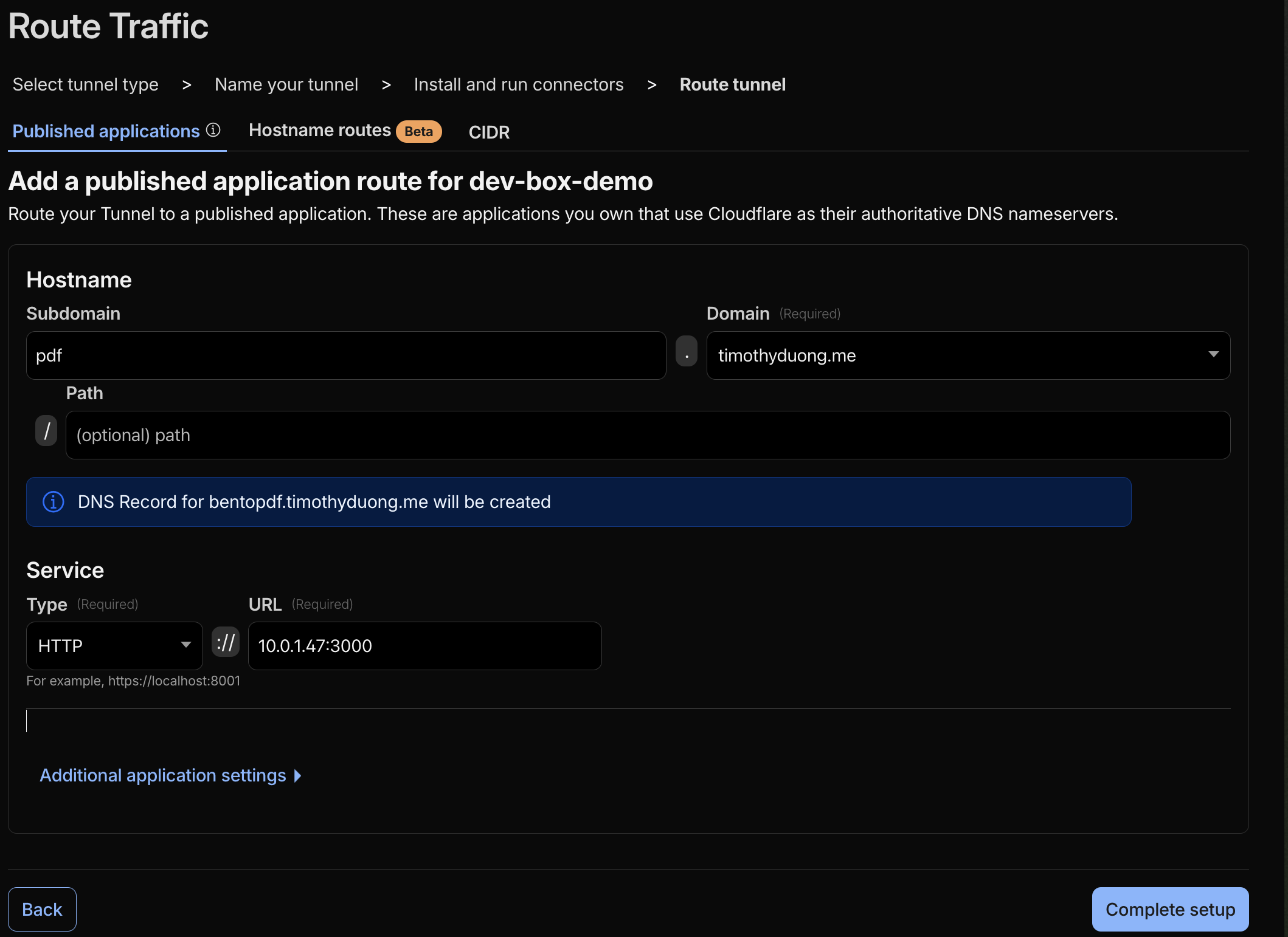 - Select 'Complete Setup' and it should take you back to the Cloudflare Tunnels dashboard