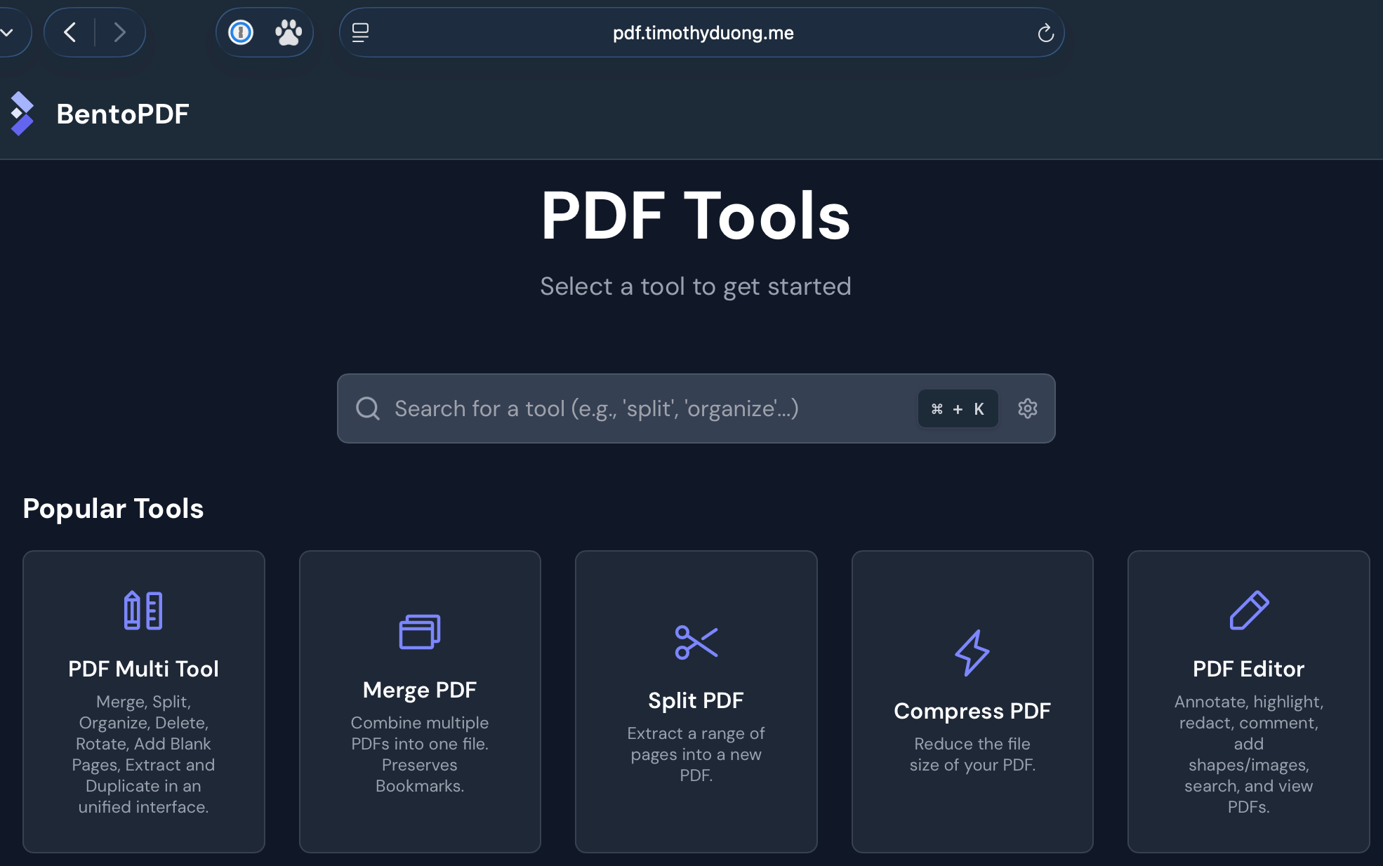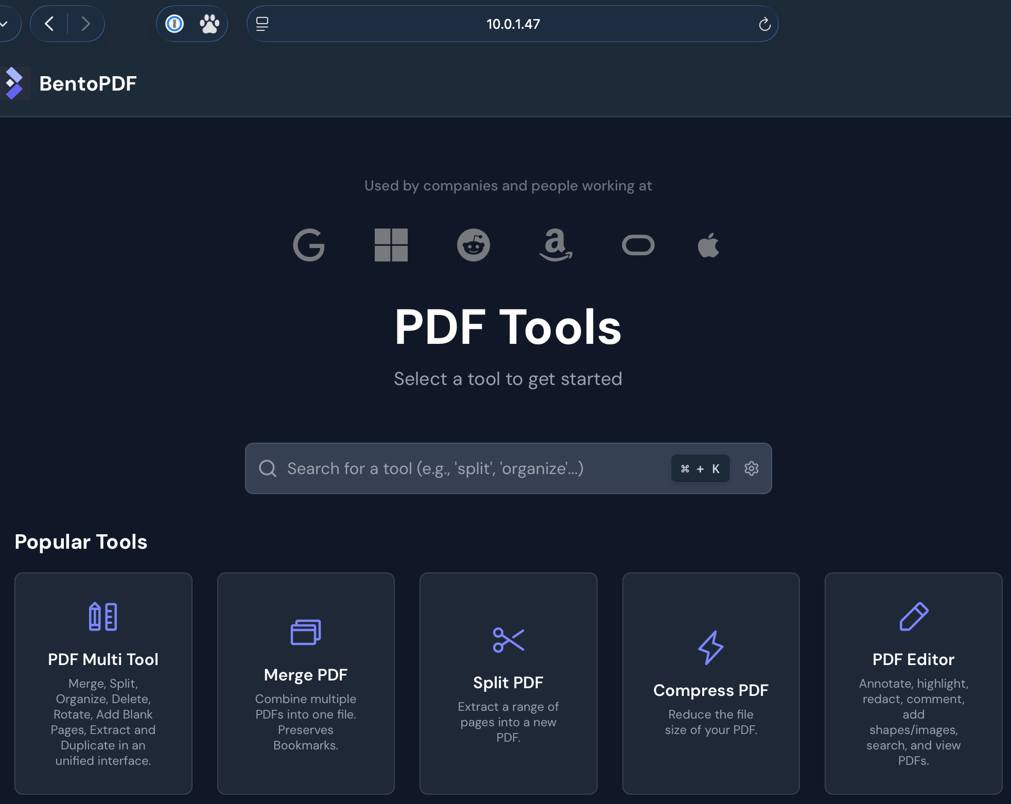 - URL: 10.0.1.47:3000 (This is the local IP address of your Ubuntu Server/host and the 3000 Port is the default PORT for BentoPDF)