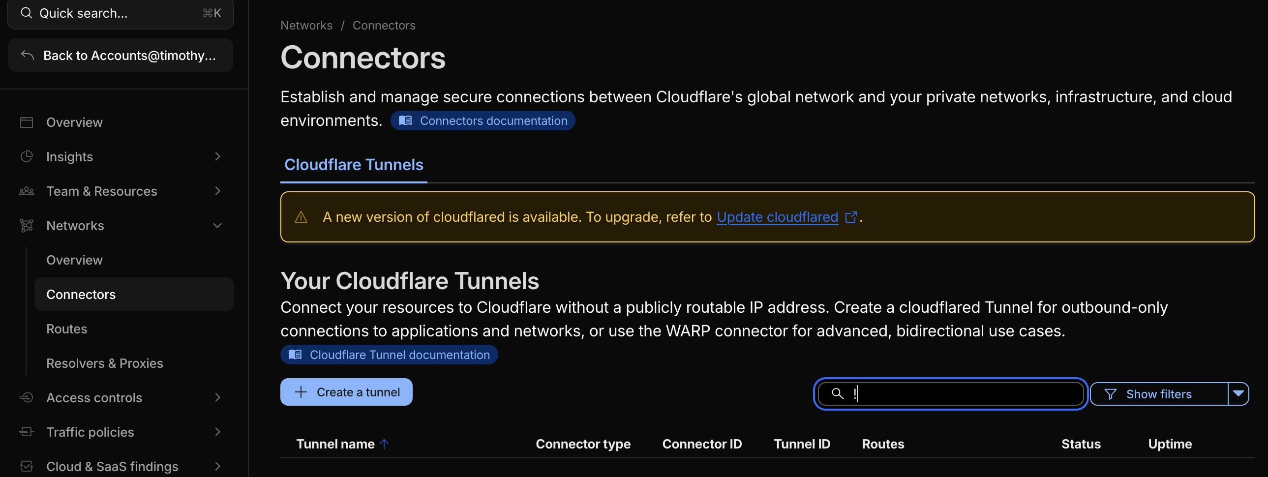 - Navigate to 'Networks > Connectors' and select 'Create a Tunnel'