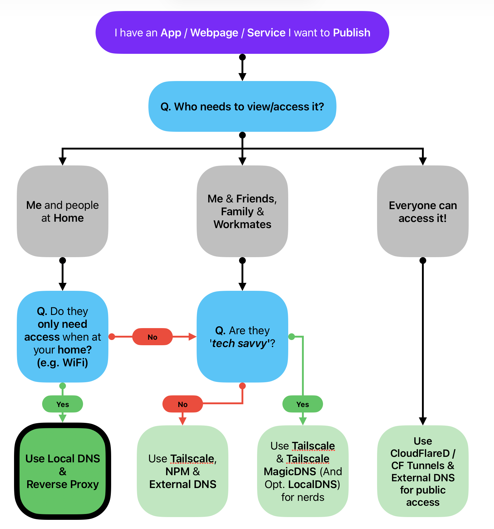 Lets have a look at the diagram below, you're in the starting purple box, you've deployed an app at home, whether it is on your computer or raspberry pi, it's sitting there and you either access it via 192.168.1.X:portnumber (like http://192.168.1.1:8080) and now, you want to achieve some level of access for you and/or your family/friends.